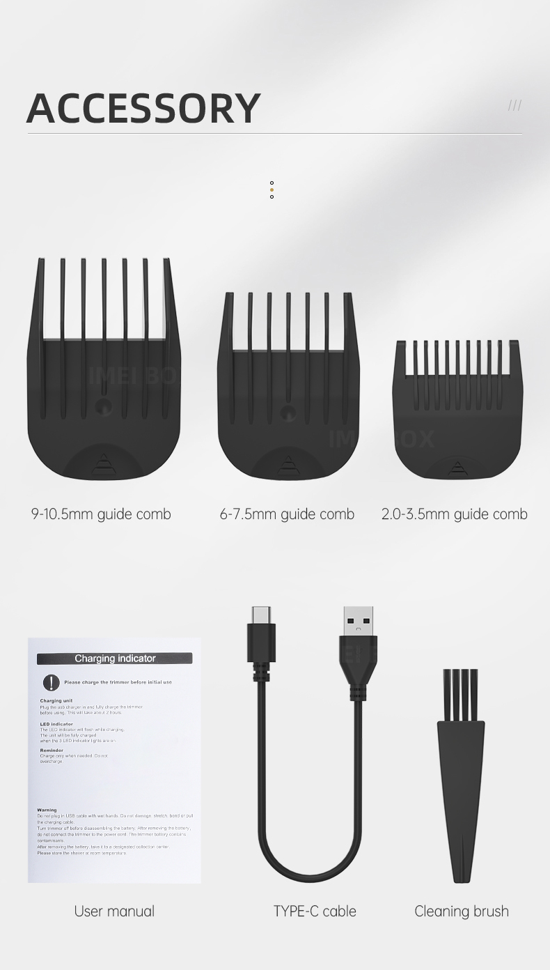 - تحتوي العبوة على مكينة حلاقة شعر الجسم، و4 أمشاط حماية، مع قاعدة شحن، بالإضافة إلى كيبل يو إس بي تايب سي مع فُرشاة تنظيف، ودليل الاستخدام.