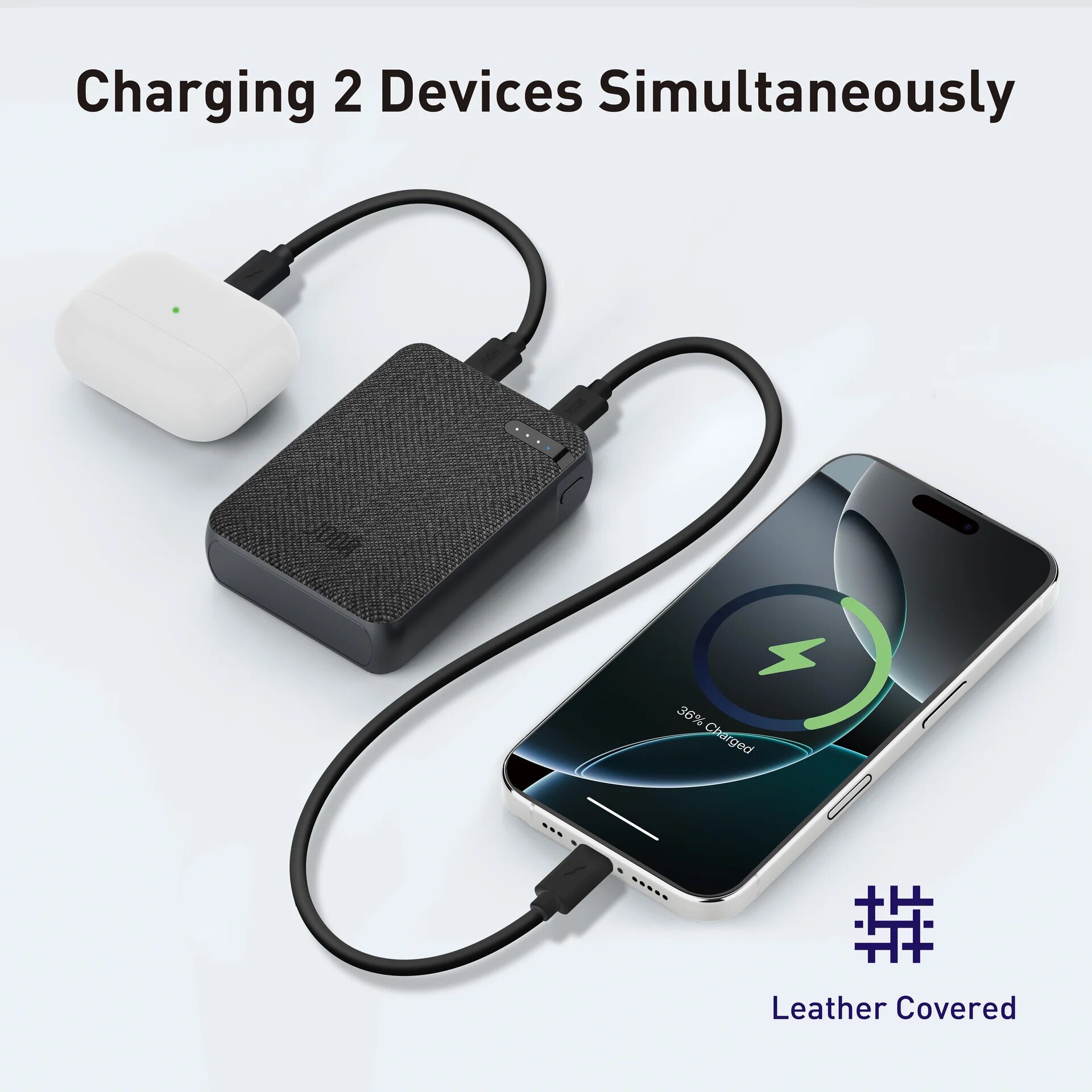 - جودا بطارية متنقلة 10000 يغطي سطحها بمادة شبيه بالجلد مما يُضيف القوة والمتانة على البطارية والأناقة في نفس الوقت.