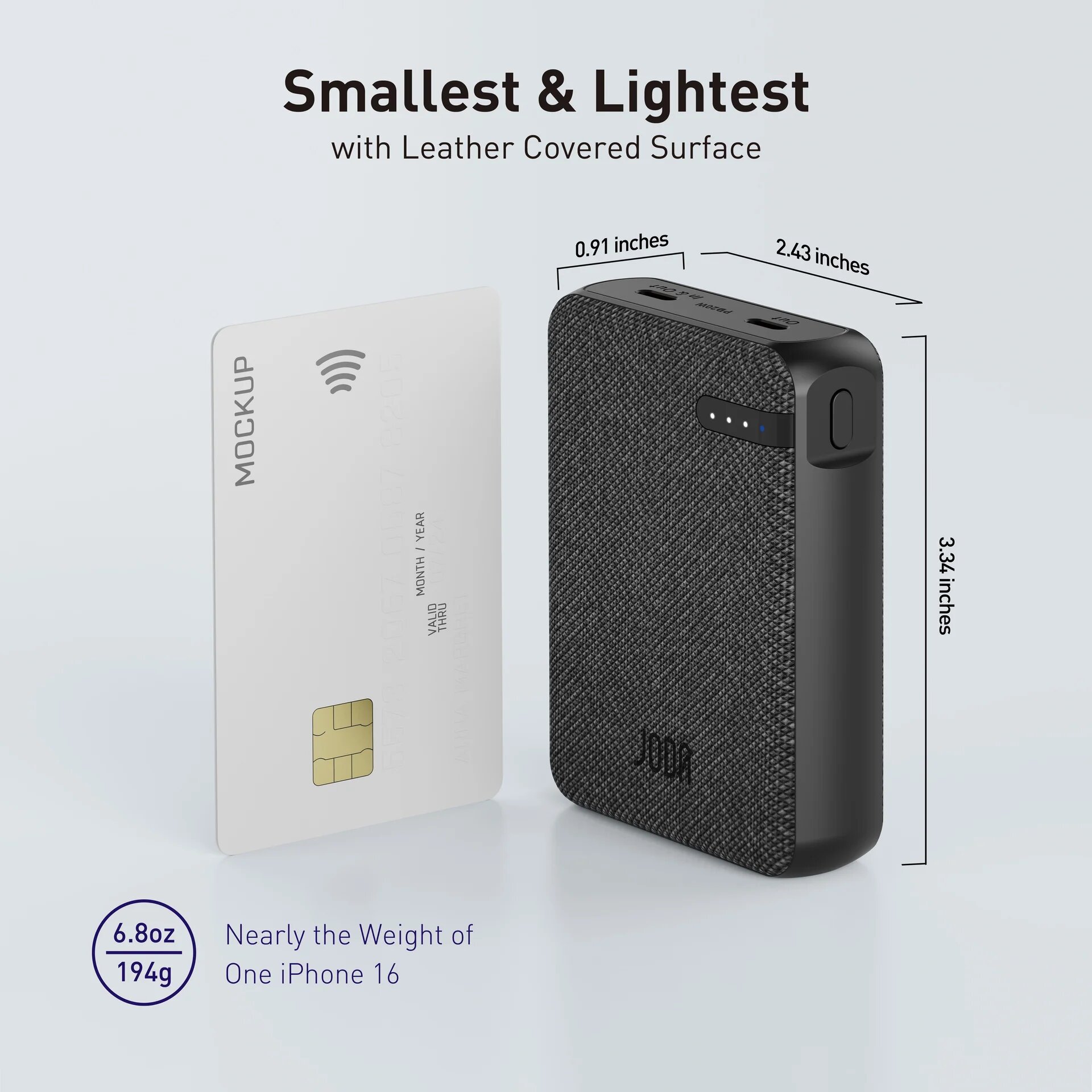 - صُمم جودا باور بانك 20 واط بتصميم بأبعاد صغيرة بحجم بطاقة الائتمان مما يسهل حمله في اليد والتحرك به أينما تكون.